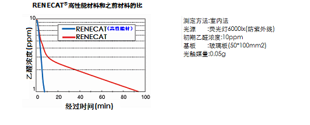 分别使用之前的材料和「RENECAT?高性能材料」(新品),对病房内的乙醛的分解速度进行比较,高性能材料的分解时间缩短至以前材料的10分之1。