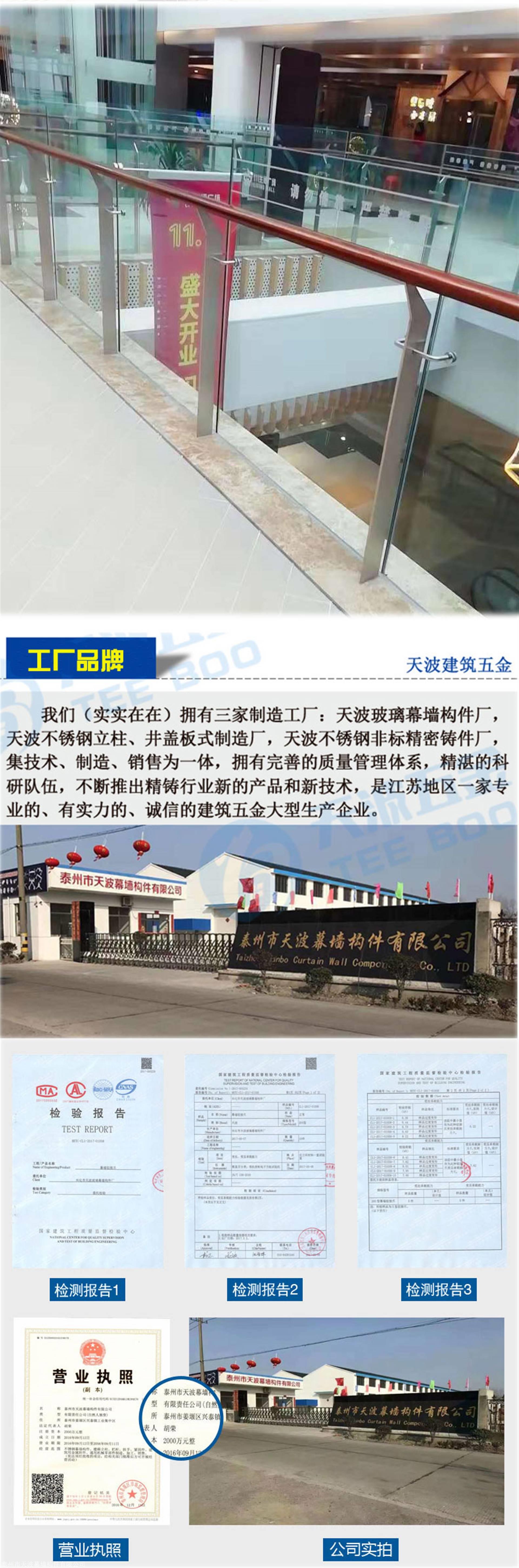 【天波建筑五金】创立于2007年,位于中国不锈钢名镇——江苏兴化戴南镇,"质量求生存,诚信求发展"是我们的一贯理念。旗下工厂兴化市天波玻璃幕墙配件厂为产品生产总部,主要生产驳接爪、大理石挂件、楼梯立柱、窨井盖、不锈钢非标定做等各种不锈钢产品, 我们为成为一家专业的建筑五金品牌而孜孜不倦,七年来在点支式幕墙构件等建筑五金领域中发展巨大,逐渐以成为集科研、开发、生产、销售、售后为一体的中大型企业。