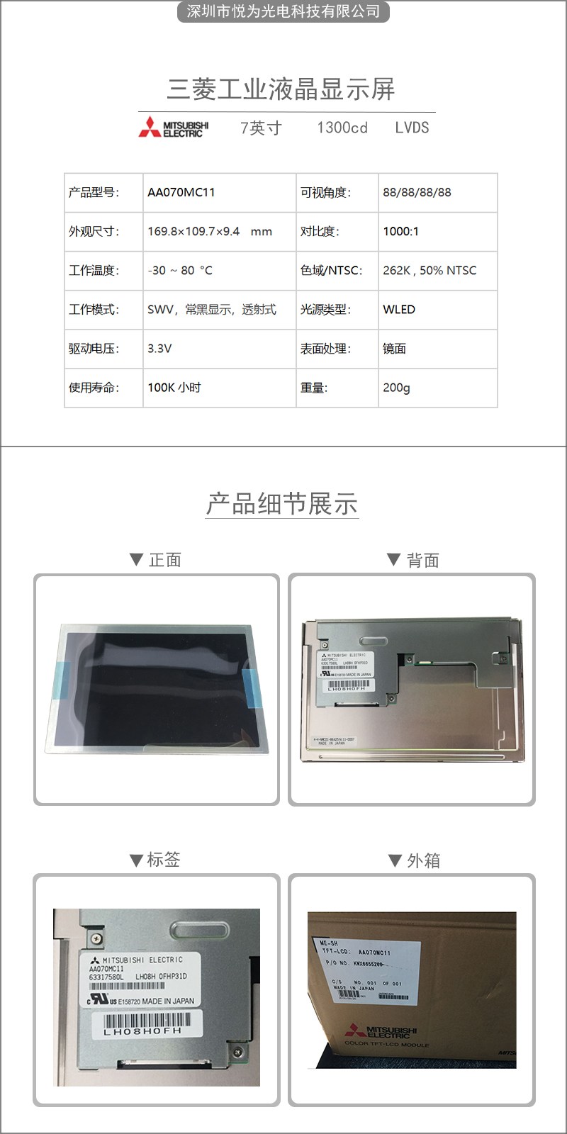 郑重声明:产品 【7寸三菱LCD液晶屏工业显示屏触摸屏车载屏AA070MC11】由 深圳市悦为光电科技有限公司 发布,版权归原作者及其所在单位,其原创性以及文中陈述文字和内容未经(企业库qiyeku.cn)证实,请读者仅作参考,并请自行核实相关内容。若本文有侵犯到您的版权, 请你提供相关证明及申请并与我们联系(qiyeku # qq.com)或【