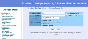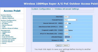WS58005A无线设备的空中速率高达54Mbps, 同时支持Super G和Turbo A模式,在Turbo A模式下可高达 108 Mbps 。具有射频链路测试能力,有效地解决了无线网络安装中最困难的安装配置问题,使其安装和维护简便易行。