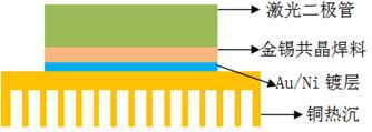 激光加工的普及使得功率激光二极管的应用越来越广泛。随着封装技术和芯片技术的提高,功率激光二极管的功率越来越高,随之而产生的热量达到了惊人的密度。有资料显示,功率激光二极管工作时能够产生的热量密度可达4KW/cm2。如此高的发热量,如果没有良好的散热通道及时将热量散发出去,会在激光二极管产生极高的热量堆积,导致激光二极管的发光效率下降。一般的是将激光二极管直接焊接到铜热沉上去,使系统的热阻减少。热量能够快速传递到铜热沉而散逸出去。功率激光二极管的断续工作,形成了很大的交变温度差,造成焊料的互连界面承受非常大的热应力,很容易造成焊点蠕变与热疲劳失效。采用金锡共晶合金焊料封装就可很好地解决这些问题。将激光二极管芯片通过预成型金锡焊料直接焊接到铜热沉上,不仅大大提高了导热能力,同时还有较高的强度和较好的抗热疲劳特性。特别是芯片底部覆金与镀金的热沉封装面可以直接用金锡合金焊接而不需要制备过度金属。封装时,将预成型共晶合金焊料放置于铜热沉的镀金焊盘和激光二极管镀金底层之间,通过回流或者其他焊接形式焊接好,如图1.4所示。